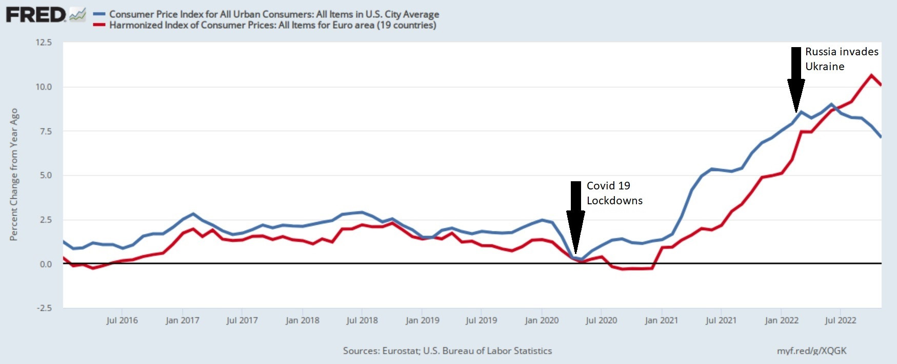 Agreed. I came across the graph below showing inflation over recent years. The point where money was printed for Lockdowns is evident. The Russian invasion of Ukraine and Brexit are not evident. I added the arrows and annotation.