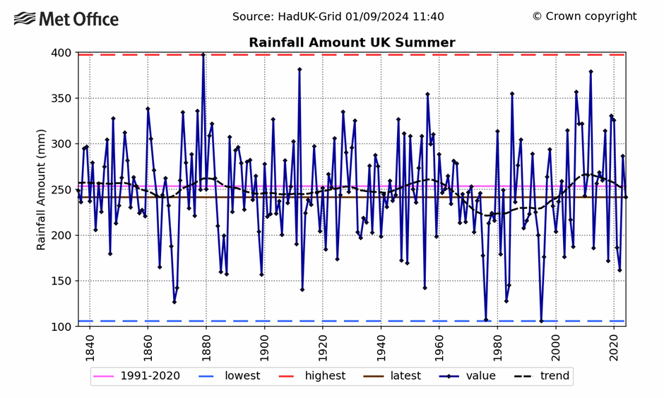 Skea also made several other equally absurd predictions, such as summer droughts in Britain becoming more frequent. Again, the actual data show that long term rainfall trends have changed little since 1840. If anything droughts have become less frequent: