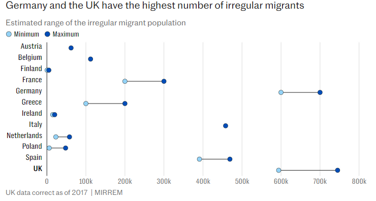 This is more than double the 300,000 in France and ahead even of the upper estimate of 700,000 in Germany, which has the second-largest population of illegal migrants in Europe.