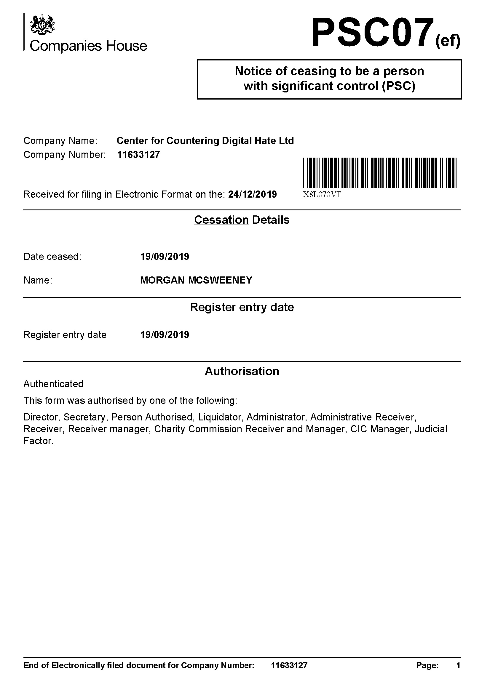 There are two CCDH companies – one is UK and the other is in the USA both with Imran Ahmed linking them and perhaps others. And the people McSweeney arranged to be appointed when he relinquished control – including surprisingly Tory Damian Collins [whose interests was Collins representing?] and those who came and left thereafter: 28 Sep 2021 Appointment of Mr Imran Ahmed as a director on 9 September 2021 16 Oct 2020 Appointment of Mr Damian Noel Collins as a director on 20 July 2020 25 Jul 2022 Termination of appointment of Damian Noel Collins as a director on 22 July 2022 01 Nov 2022 Appointment of Mr Damian Noel Thomas Collins as a director on 28 October 2022 23 Oct 2020 Appointment of Ms Sarah Ayesha Saran as a director on 5 December 2019 23 Oct 2020 Appointment of Lord Jonathan Oates as a director on 5 December 2019 18 Oct 2021 Termination of appointment of Jonathan Oates as a director on 12 October 2021 23 Oct 2020 Appointment of Mr Thomas Conrad Lewis Brookes as a director on 9 October 2020 16 Oct 2020 Appointment of Mr Simon James Clark as a director on 4 May 2020… Read more »