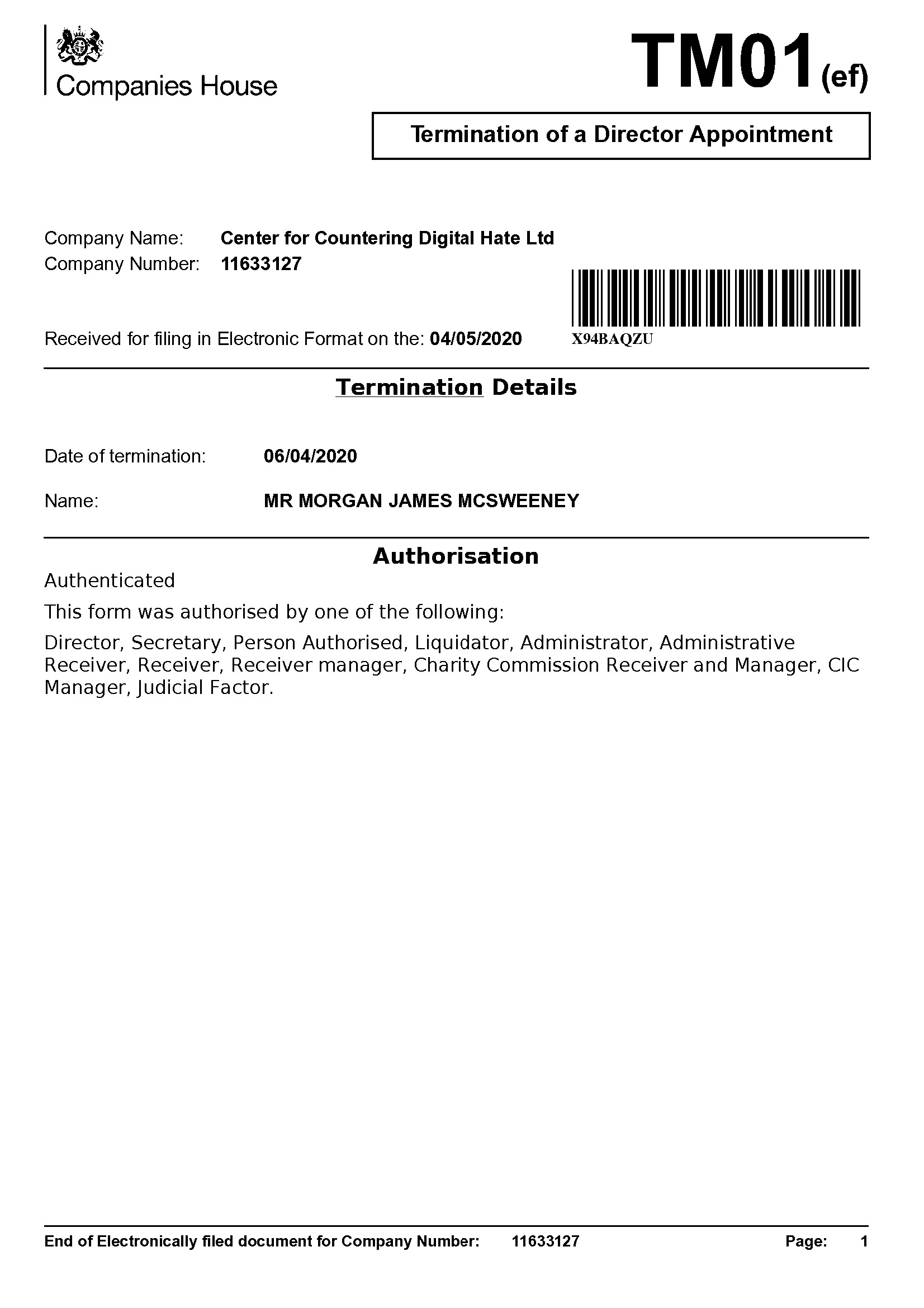 And this is an extract of the incorporation documents showing McSweeney set it up. The original name was Brixton Endeavours which later changed to Centre for Countering Digital Hate.