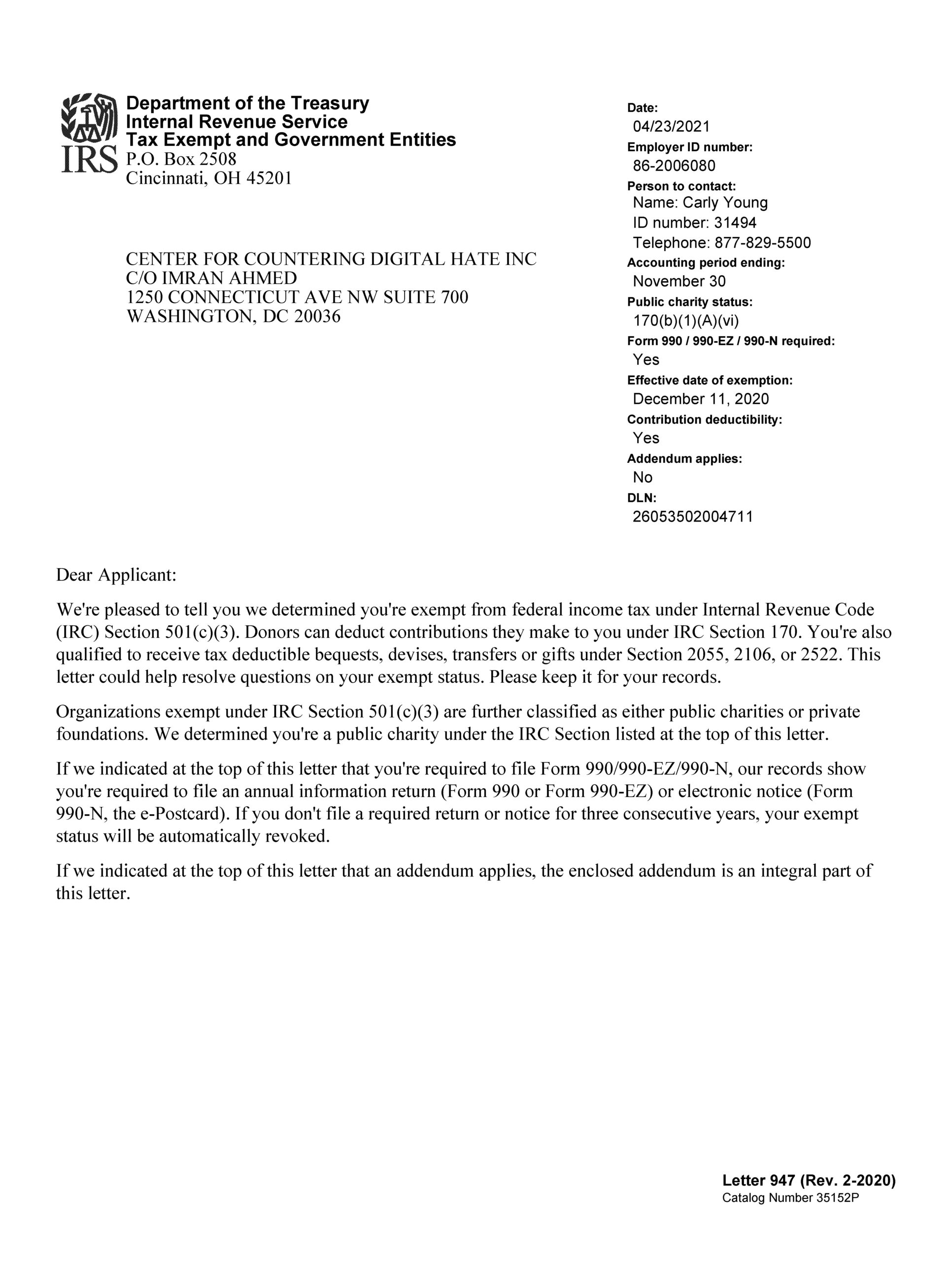 Attached shows he was involved in setting up the US CCDH and applied for its US tax exempt status.