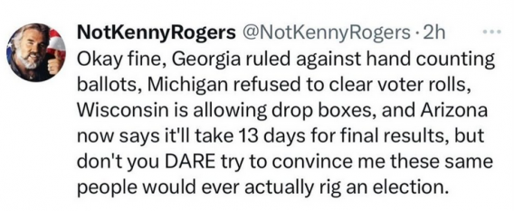 30 mn vote fraud in 2020 – one of the reasons for the Corona scamdemic was to LD the entire country, 160 mn ‘voted’ vs 125 mn in 2016…that is 100% of all registered voters – safest election evah!