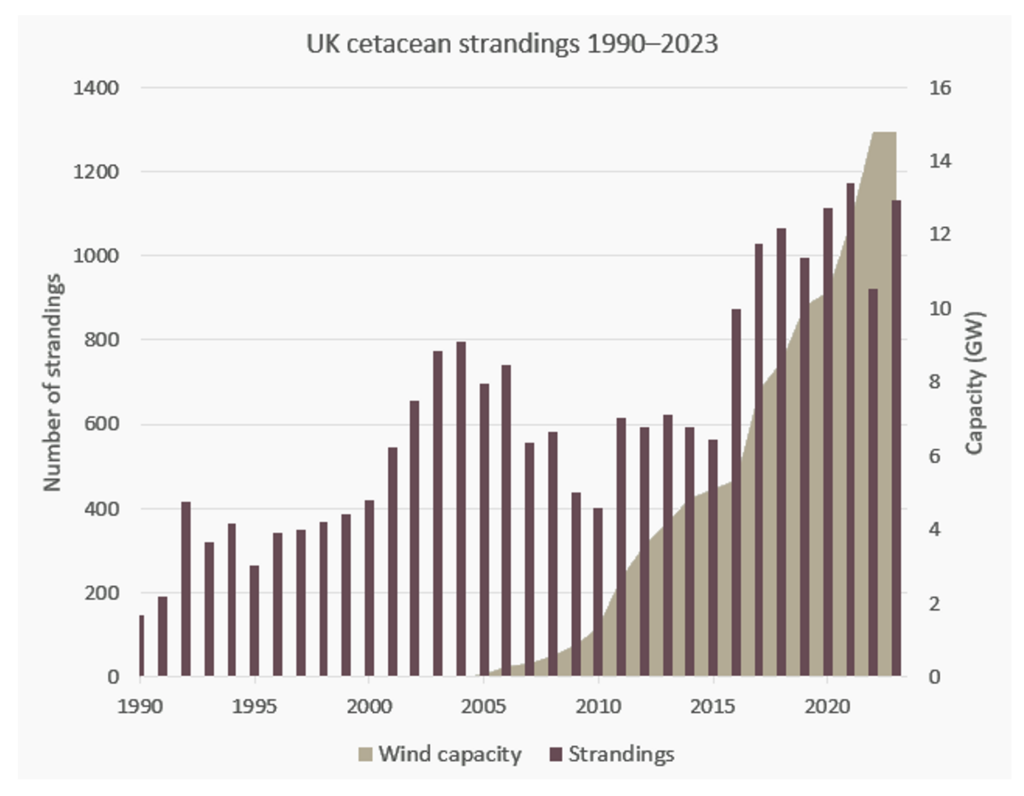 Andrew Montford of Net Zero Watch has updated his graph on the stranding of U.K. cetaceans and compared it to the rise of offshore wind capacity.