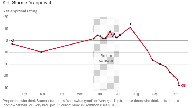 But by this month, ahead of Rachel Reeves’ Budget on Wednesday, his personal rating had fallen to –38 – a net drop of 49.