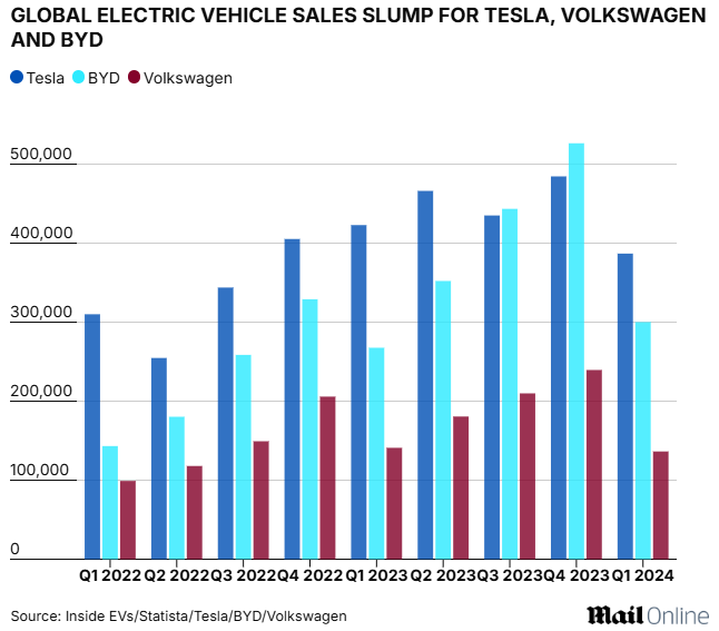 Despite growing steam long-term, Elon Musk’s Tesla saw quarterly EV sales fall from a peak of 484,500 in Q4 2023 to just 386,800 in the first quarter of 2024.