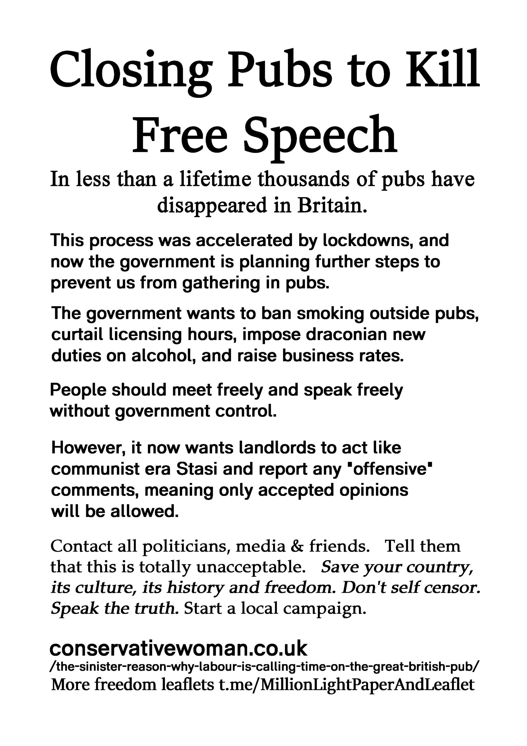 Closing Pubs to Kill Free Speech – latest leaflet to print at home and deliver to neighbours or forward to politicians, your new MP, your local vicar, online media and friends online. Start a local campaign.