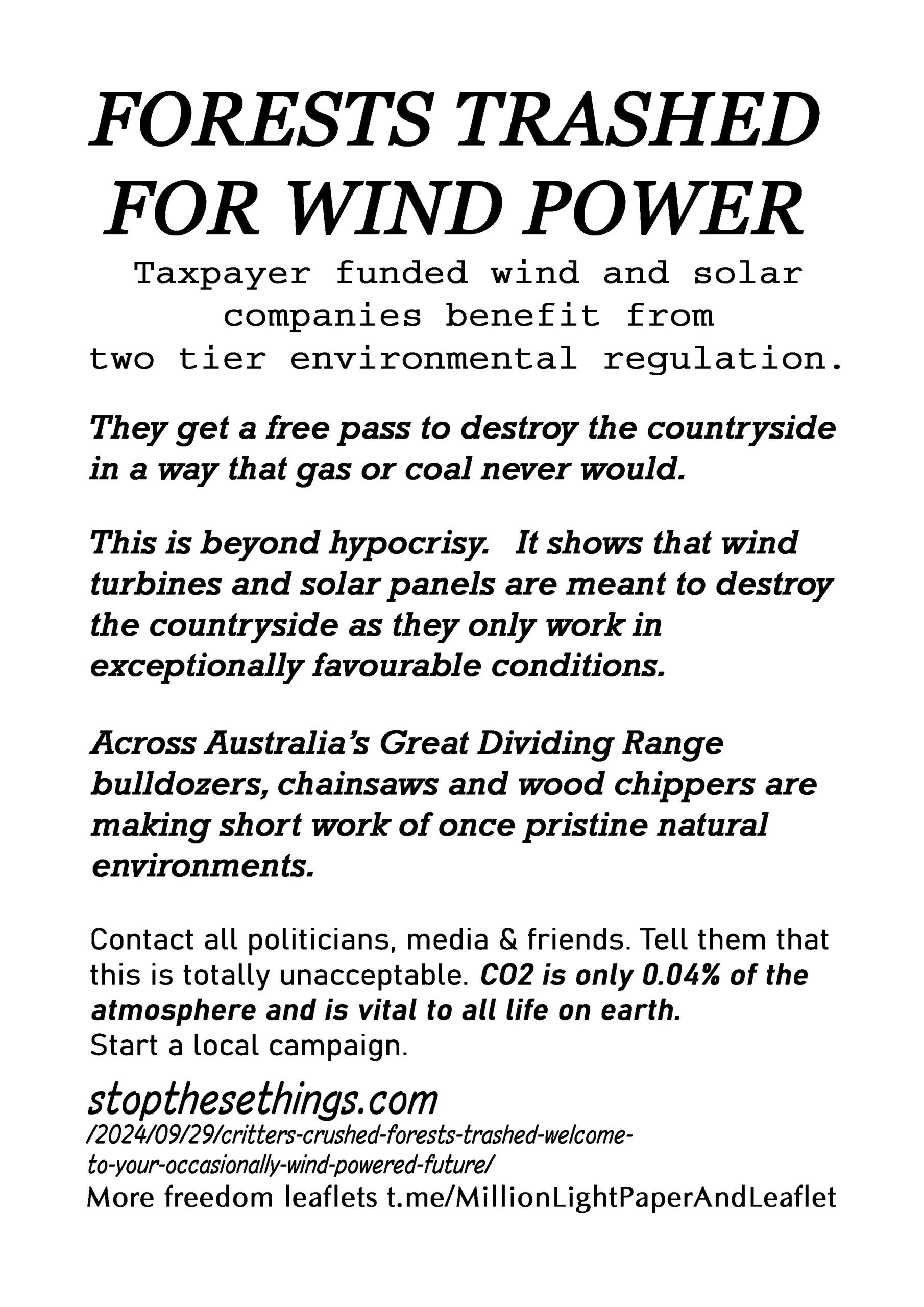 Forests Trashed for Wind Power – latest leaflet to print at home and deliver to neighbours or forward to politicians, your new MP, your local vicar, online media and friends online. Start a local campaign. We have over 200 leaflet ideas on the link on the leaflet.