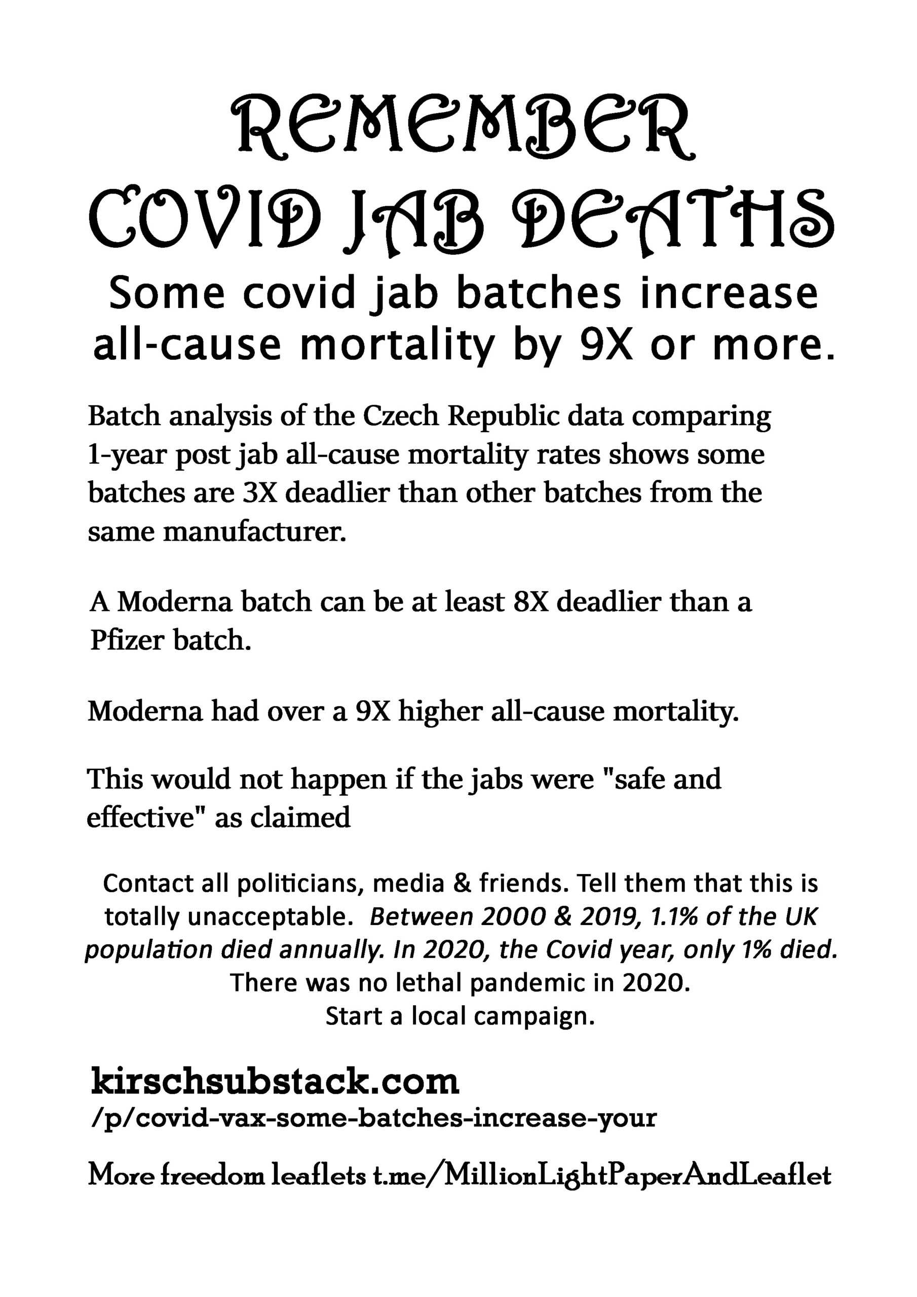 Remember Covid Jab Deaths – latest leaflet to print at home and deliver to neighbours or forward to politicians, your new MP, your local vicar, online media and friends online.