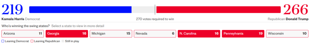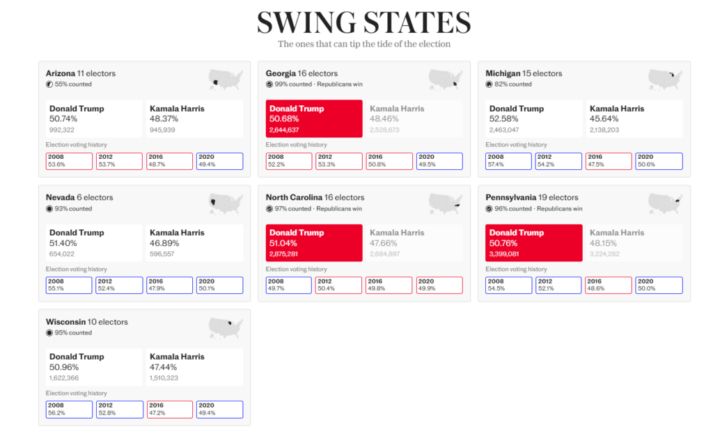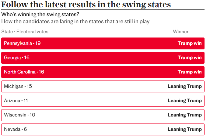 The Republican said he had won an “unprecedented and powerful mandate” after taking the key swing states of North Carolina, Georgia and Pennsylvania, while appearing on course to sweep Wisconsin and Michigan in a landslide.