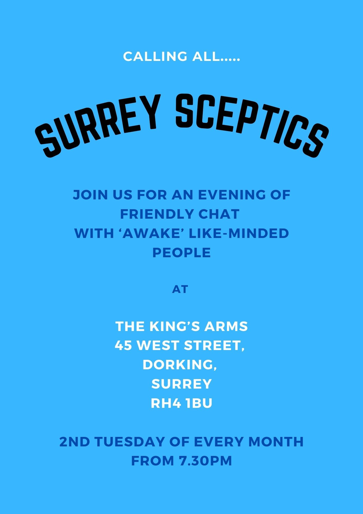Sceptic in Surrey, Sussex, S London and beyond? Join us for a sociable evening with like-minded folks tomorrow evening