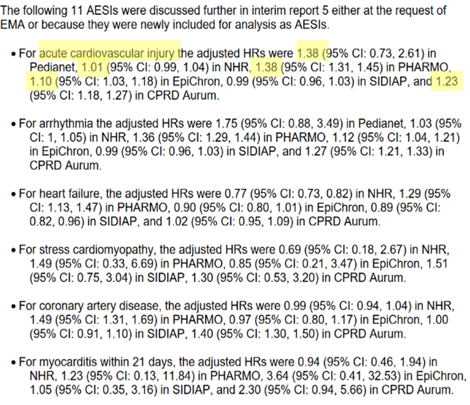 Last month I wrote about Pfizer’s latest analysis of millions of patients’ data from a range of European national healthcare systems including the NHS. The data are segmented by categories like age, sex and, importantly, the Covid vaccination status of each patient (the very data which governments around the world continue to refuse to make public). Pfizer’s results include a ‘Hazard Ratio’ (HZ) which is a measure of the relative frequency of a serious adverse event between the Covid vaccinated and unvaccinated groups. As I said last month, Pfizer itself is now reporting to medicine regulators that its Covid vaccine has significantly increased the occurrence of a range of heart conditions. Here’s a screenshot :
