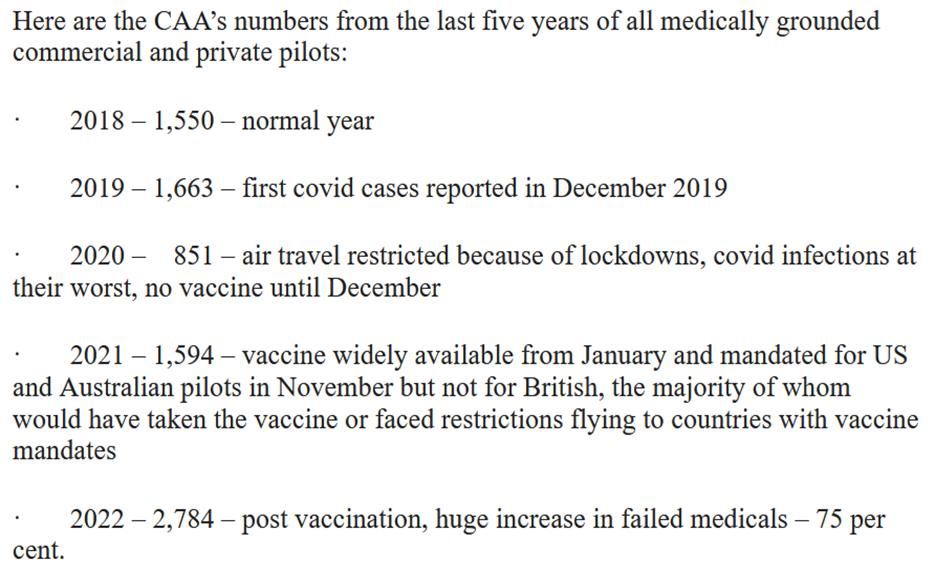 “Not so fast,” you might say. “Even if Pfizer itself is now saying that its Covid vaccine increases the frequency of heart problems, the affected pilots will no longer be flying because they will have been screened out by the regular medicals which pilots have to pass to keep their licence.” And it’s true, the number of U.K. pilots failing their aero medicals (all causes) has soared. Shout out to Sally Beck for reporting on that late last year: