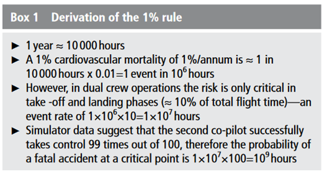 The corresponding ‘rule’ for a solo pilot is an order less (0.1% per year) because there is no second pilot to take over.