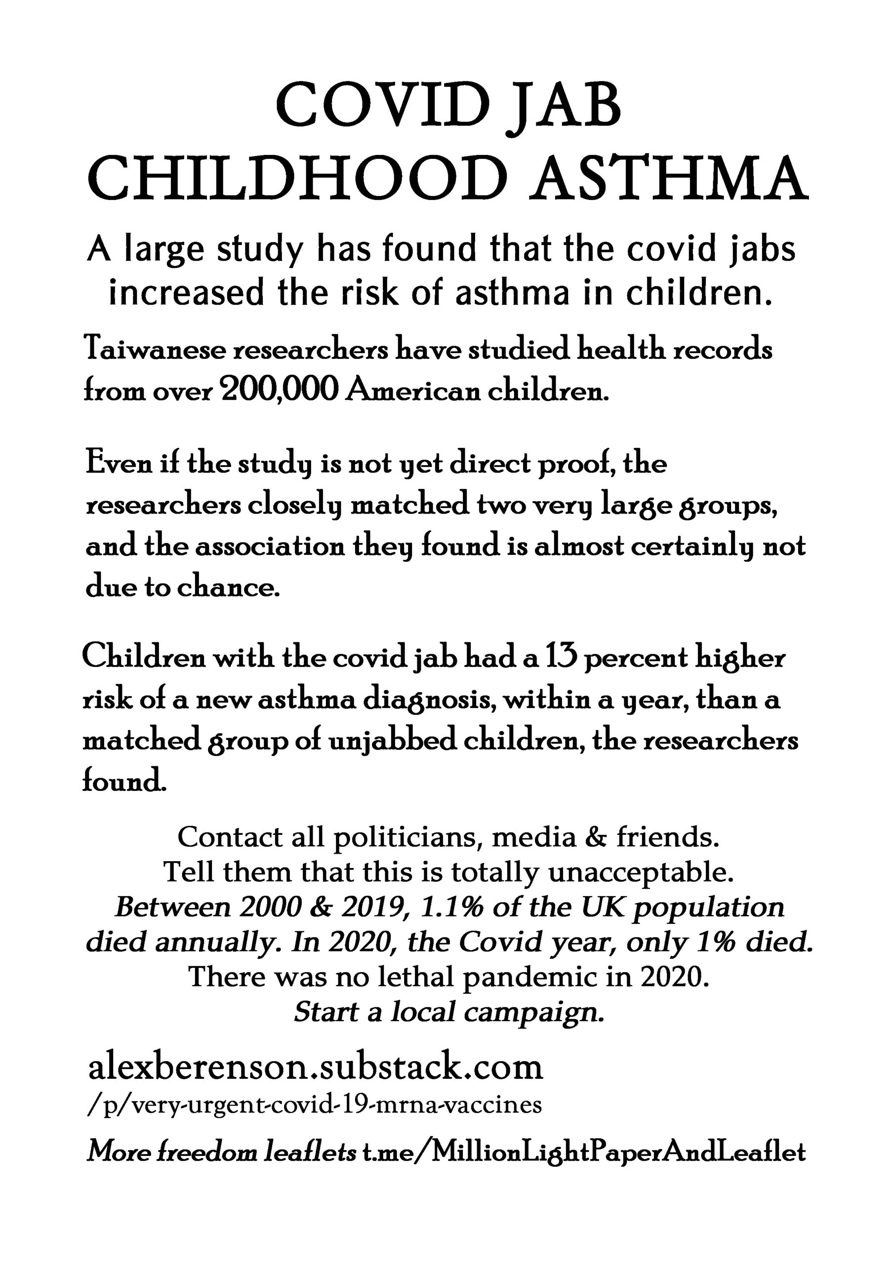 Covid Jab Childhood Asthma – latest leaflet to print at home and deliver to neighbours or forward to politicians, your new MP, your local vicar, online media and friends online. Start a local campaign. We have over 200 leaflet ideas on the link on the leaflet