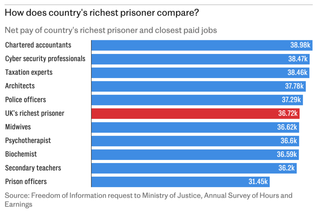 Last year, the highest-paid inmate had a net salary of £36,715, according to Home Office data obtained by a freedom of information request. It means their gross pay was about £46,000.