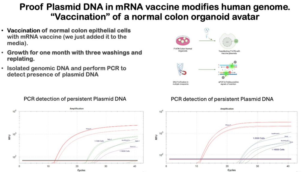 We ‘vaccinated’ some of these normal cells and grew them for a month and saw pieces of the plasmid DNA persisting in the genomic DNA of the ‘vaccinated’ cells. We detected the plasmid DNA with our qPCR protocol that was posted to X several months ago.