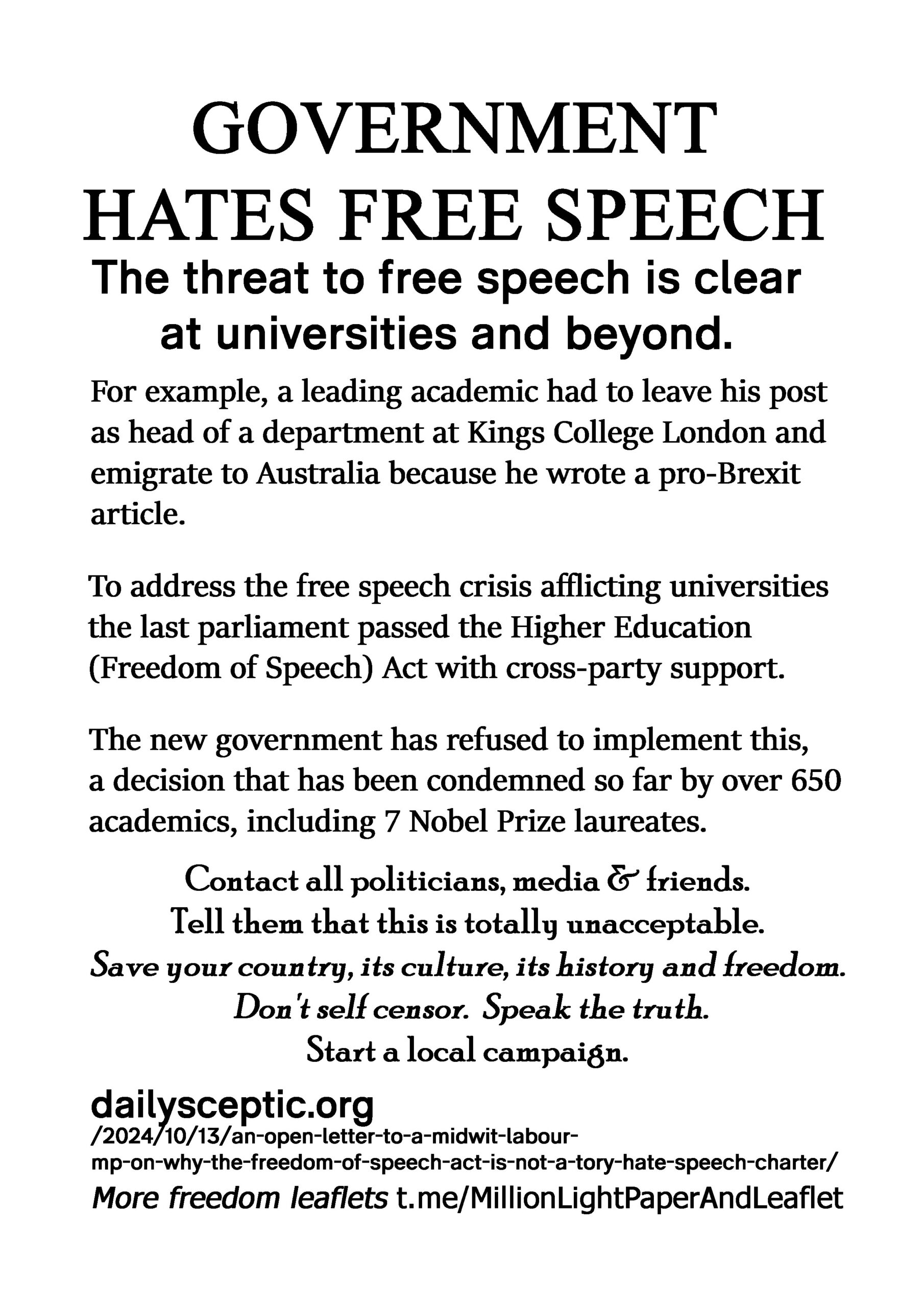Government Hates Free Speech – latest leaflet to print at home and deliver to neighbours or forward to politicians, your new MP, your local vicar, online media and friends online. Start a local campaign. We have over 200 leaflet ideas on the link on the leaflet.
