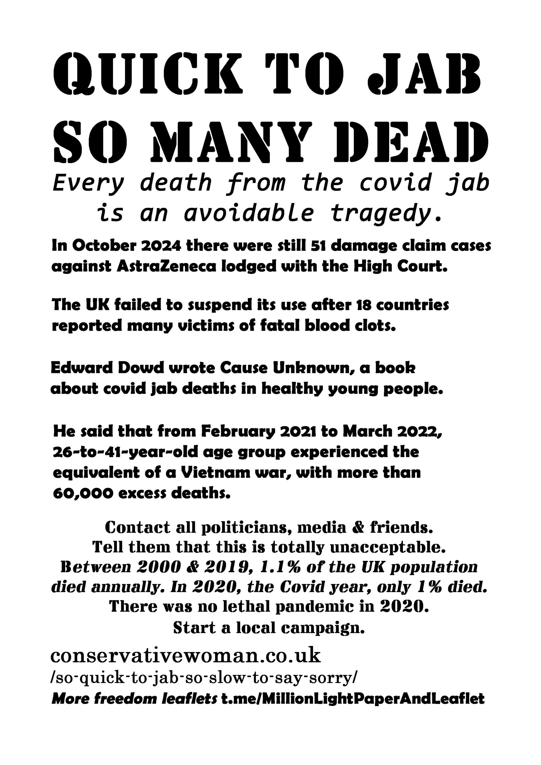 Quick To Jab So Many Dead – latest leaflet to print at home and deliver to neighbours or forward to politicians, your new MP, your local vicar, online media and friends online. Start a local campaign. We have over 200 leaflet ideas on the link on the leaflet.