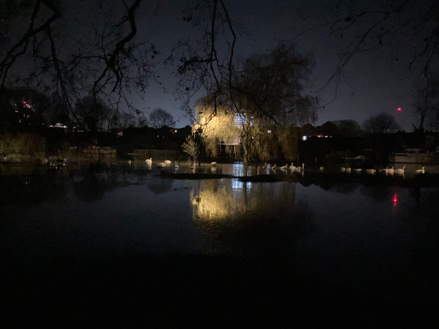 [That’s high water on Christchurch Meadows and swans swimming on the footpath, yesterday around midnight, BTW.]