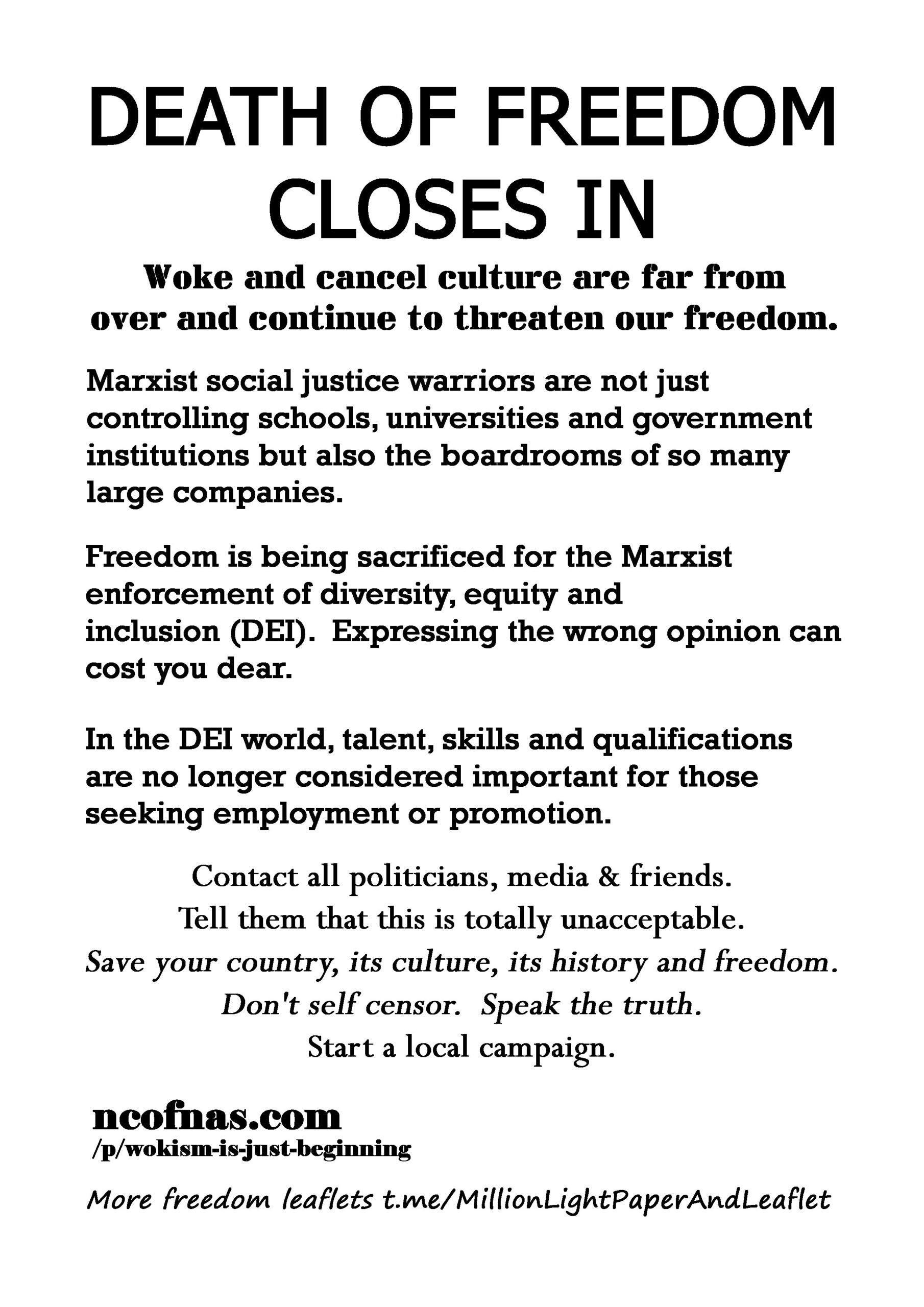 Death Of Freedom Closes In – latest leaflet to print at home and deliver to neighbours or forward to politicians, your new MP, your local vicar, online media and friends online. Start a local campaign. We have over 200 leaflet ideas on the link on the leaflet.