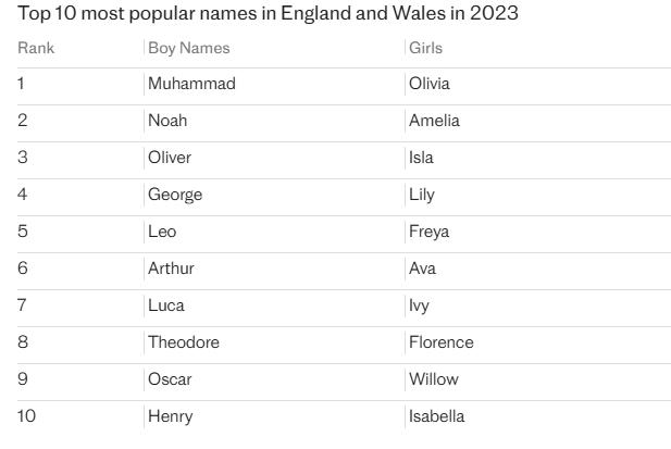 This year, the next most common variant of the Arabic name – Mohammed – is also in the top 50, coming in at the 28th most popular name in 2023, down from 27th place the year before.