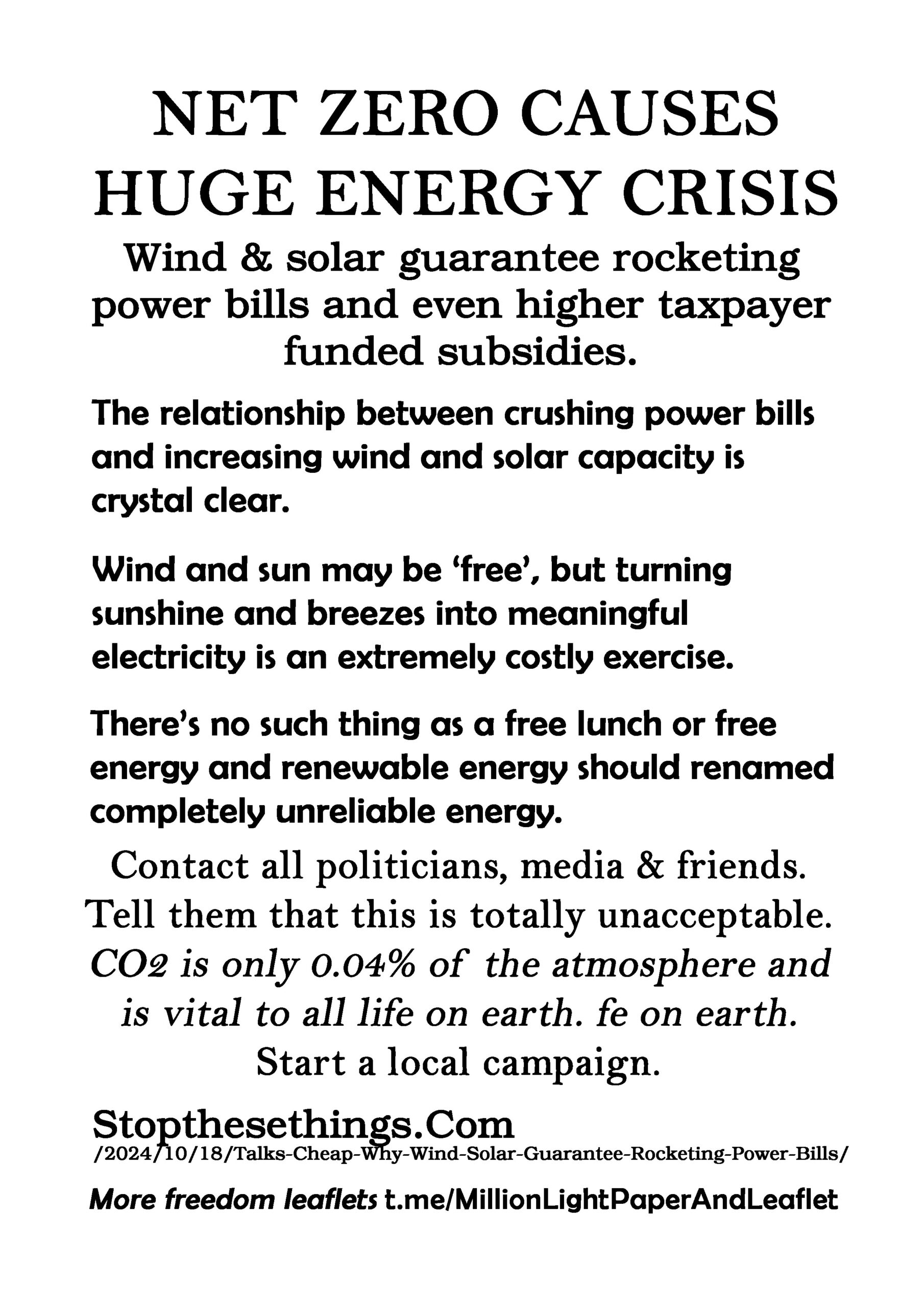 Net Zero Causes Huge Energy Crisis – latest leaflet to print at home and deliver to neighbours or forward to politicians, your new MP, your local vicar, online media and friends online. Start a local campaign. We have over 200 leaflet ideas on the link on the leaflet.