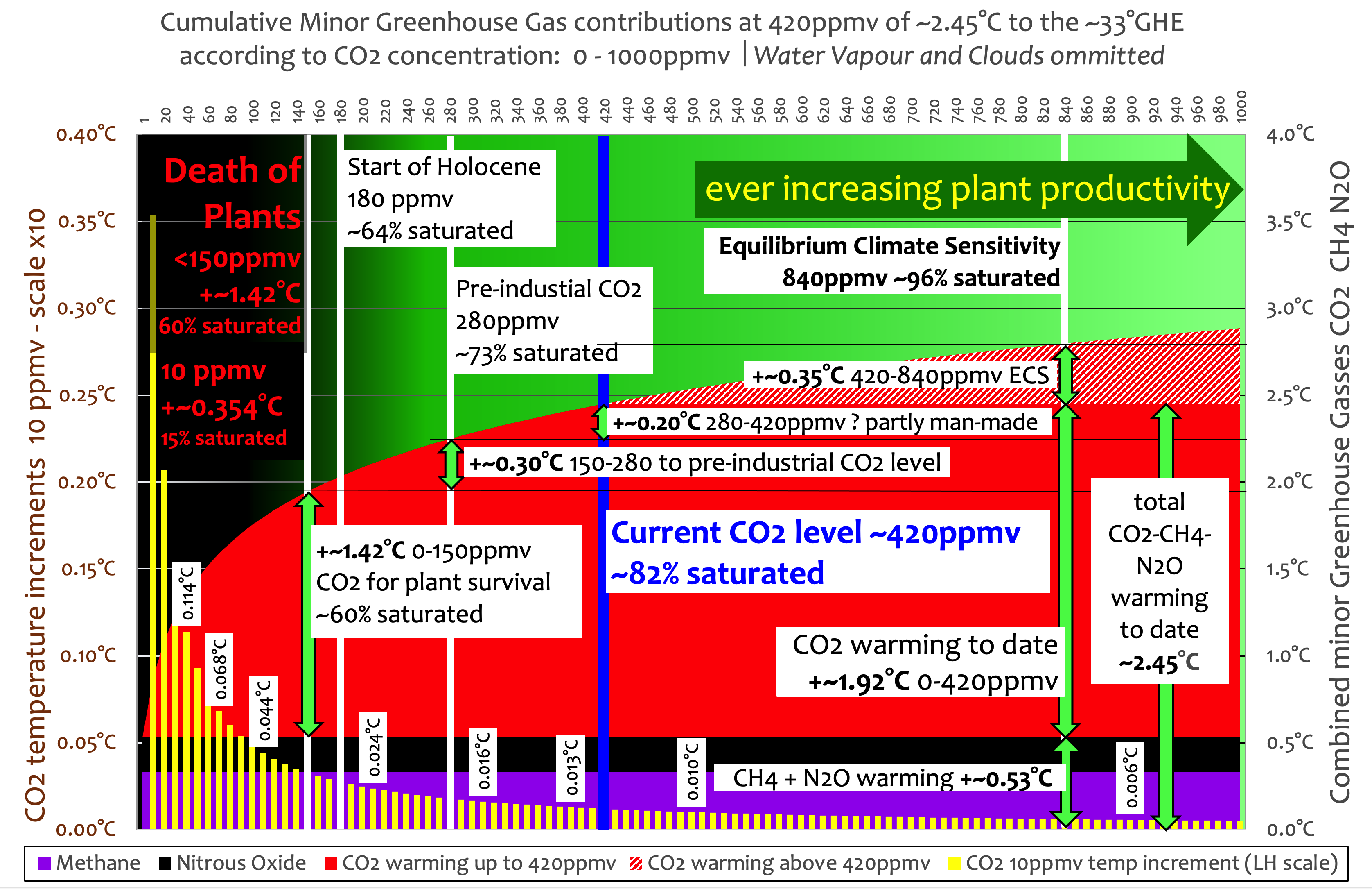 As at its current concentration atmospheric CO2 at ~420 ppmv is already ~85%+ saturated, the Global warming potential of added atmospheric CO2 is now virtually exhausted.