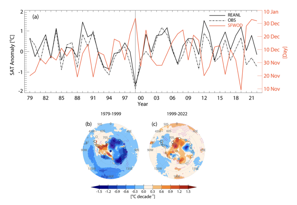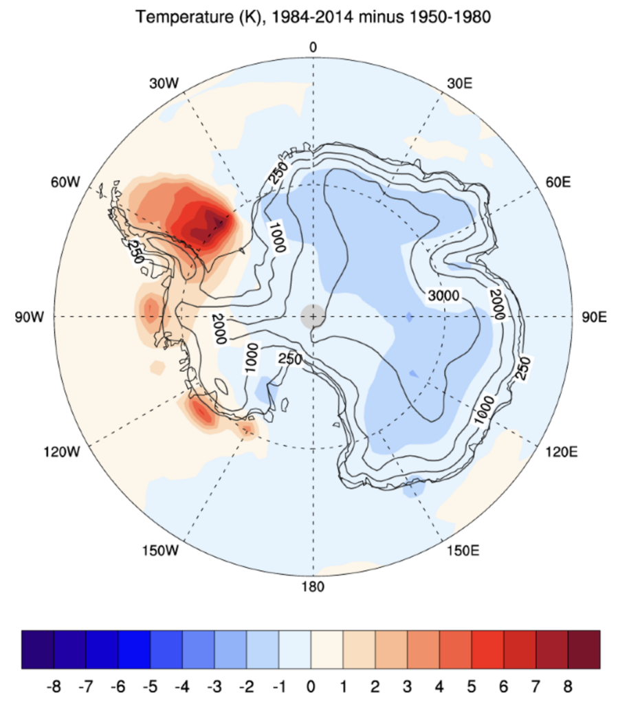 In the graph above, the dashed-dotted and black solid lines correspond to the results from 20 station observations and the ‘reanalysis’ data respectively. The two illustrations below the graph show clearly the degrees of cooling that were detected across the continent. The orange line refers to the stratospheric final warming onset data (SFWOD), which is one of a number of important natural climatic influences which the scientists examined in trying to explain the temperature changes. Meanwhile, the illustrations of temperature change correspond well with a similar one published by Singh and Polvani. It was noted in this 2021 paper that warming had been “nearly non-existent” over the last seven decades.