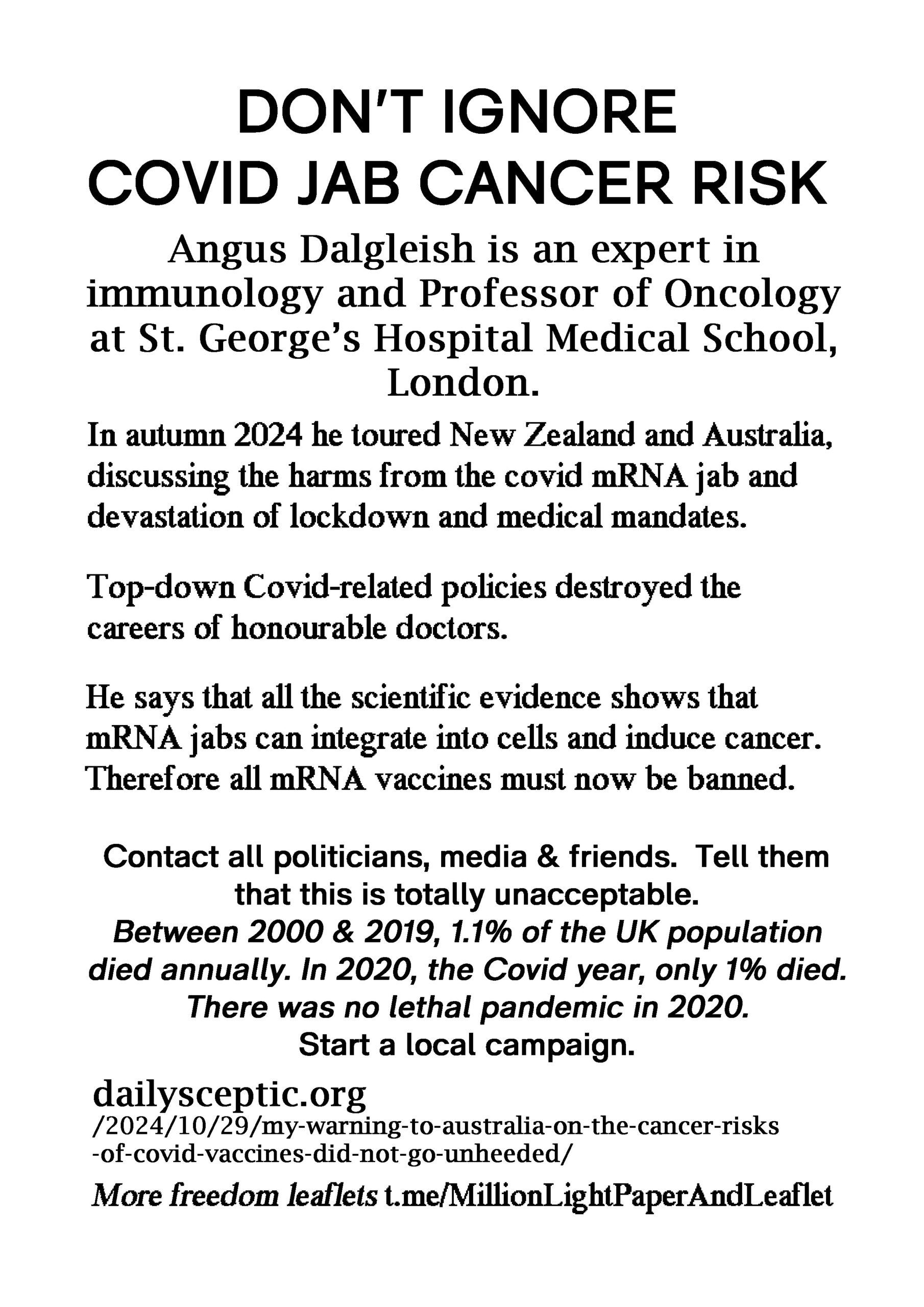 Don’t Ignore Covid Jab Cancer Risk – latest leaflet to print at home and deliver to neighbours or forward to politicians, your new MP, your local vicar, online media and friends online. Start a local campaign. We have over 200 leaflet ideas on the link on the leaflet.