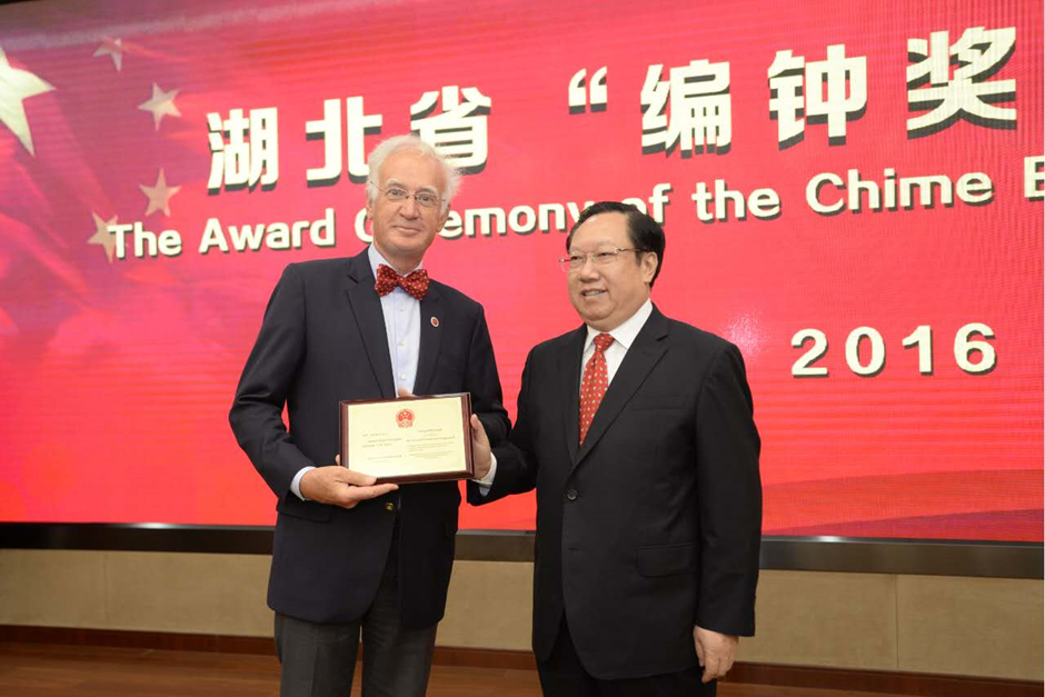 Roggendorf can be seen below receiving the “Chime Bell” award from the Governor of Hubei Province in 2016 in honor of his contributions to the German-Chinese partnership. Wuhan is the capital of Hubei Province.