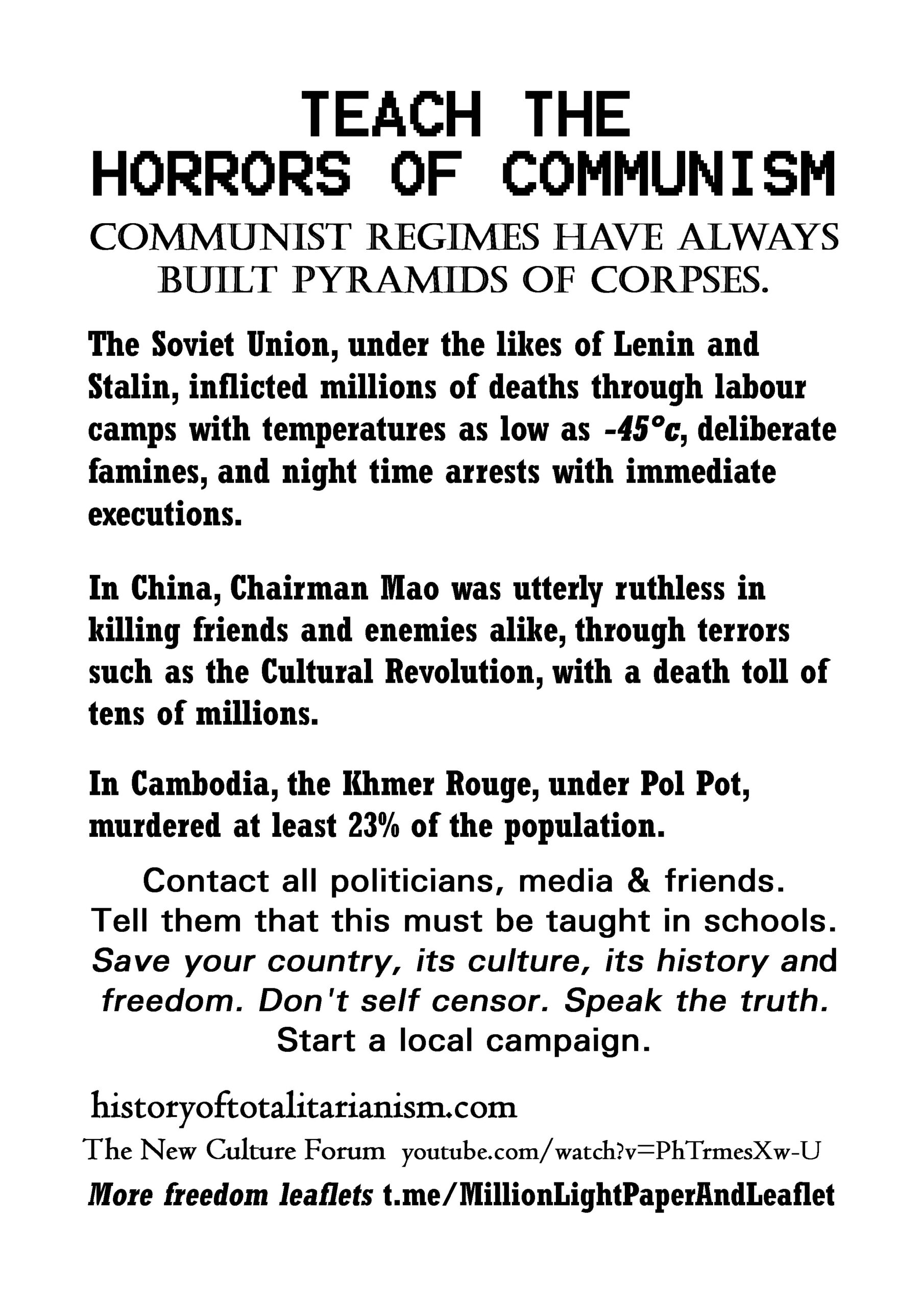 Teach the Horrors of Communism – latest leaflet to print at home and deliver to neighbours or forward to politicians, your new MP, your local vicar, online media and friends online. Start a local campaign. We have over 200 leaflet ideas on the link on the leaflet.