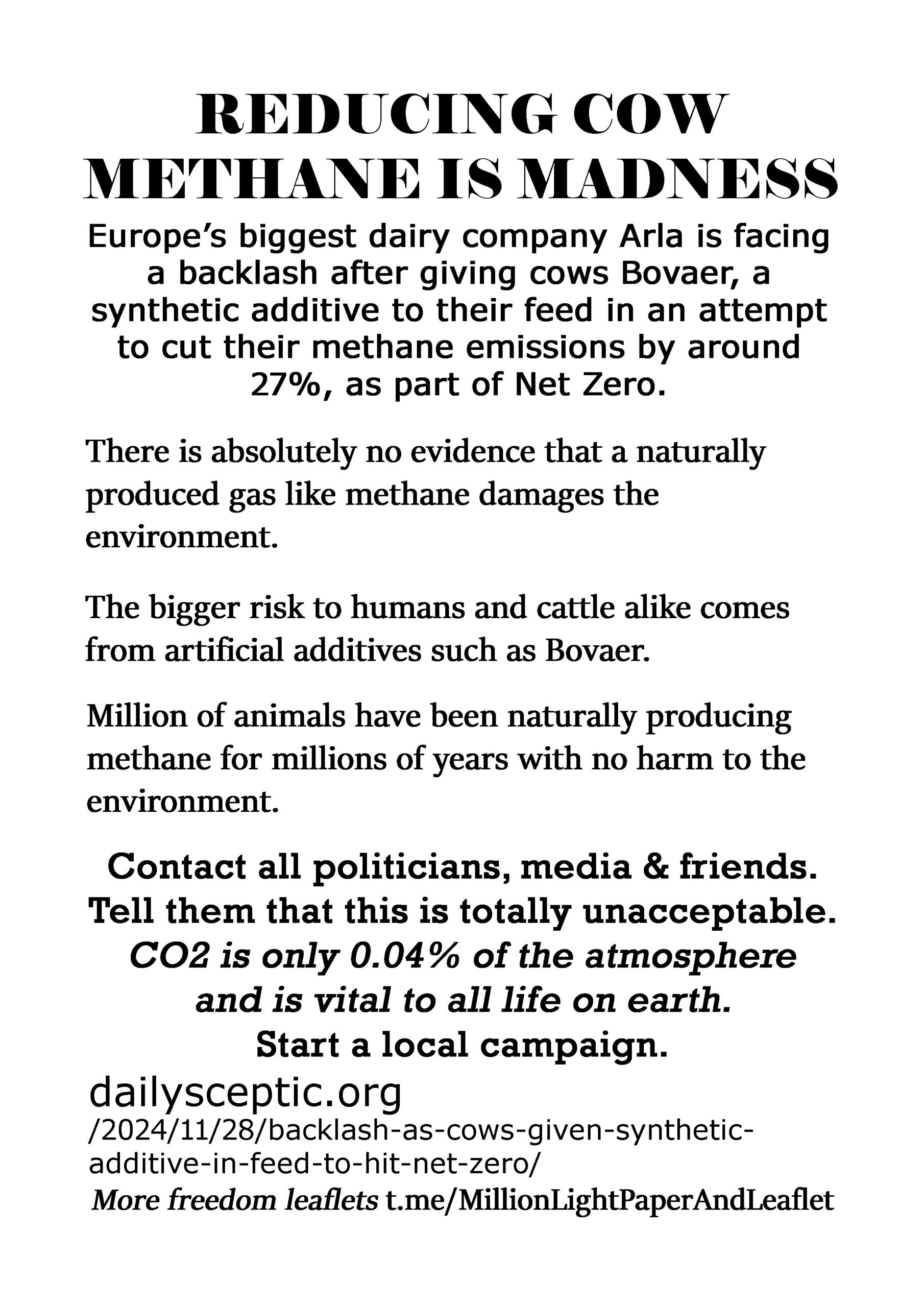 Reducing Cow Methane Is Madness – latest leaflet to print at home and deliver to neighbours or forward to politicians, your new MP, your local vicar, online media and friends online. Start a local campaign. We have over 200 leaflet ideas on the link on the leaflet.