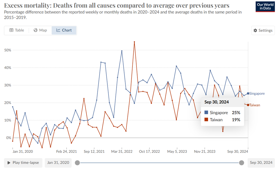 Professor David Livermore, in a recent article about life in post-pandemic Taiwan, referred to the current high excess death rate in many Asian countries. It wasn’t something of which I had been particularly conscious. A quick look at Our World in Data confirmed his claim. Excess deaths in Singapore and Taiwan since the end of 2021 and the beginning of 2022 have remained remarkably high. These were countries where the populations largely escaped high death tolls throughout the ‘pandemic’ and where the lockdowns tended to be fairly light-touch, but where the take-off in excess deaths followed the vaccine rollout in 2021 and 2022.
