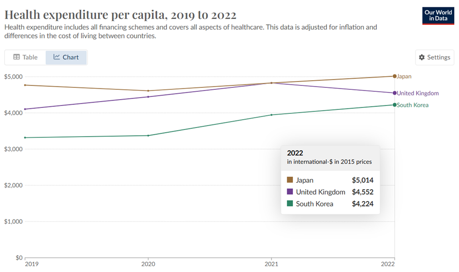 Another thing that’s not causing Asian excess deaths is a sudden drop in health spending. Japan and South Korea have seen an almost 20% rise in health spending per capita over the past five years, about twice the increase we’ve seen.