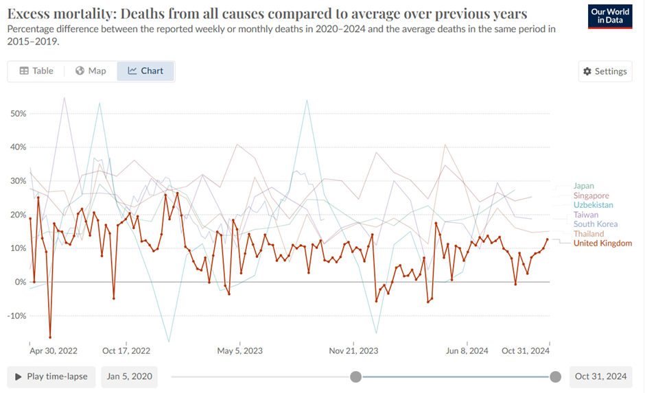 You’ll notice that the comparator data in Figure 1 is from 2015-2019. While in the U.K. claims may be made that we saw significant immigration during this period (though, not on the whole among the elderly and vulnerable), the same cannot be said of Asian countries such as South Korea or Japan, where, whilst there continues to be a gradual ageing of the population, there is very little immigration. Thus the subsequent rise in deaths is not due to a related increase in population.