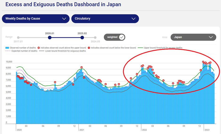 What’s the cause of all these excess deaths? Ageing populations are partly to blame, but that’s true in the U.K. too, and over just a few years this has a minimal impact. In Japan deaths from circulatory diseases, mainly heart failure, have increased significantly since 2020-21.