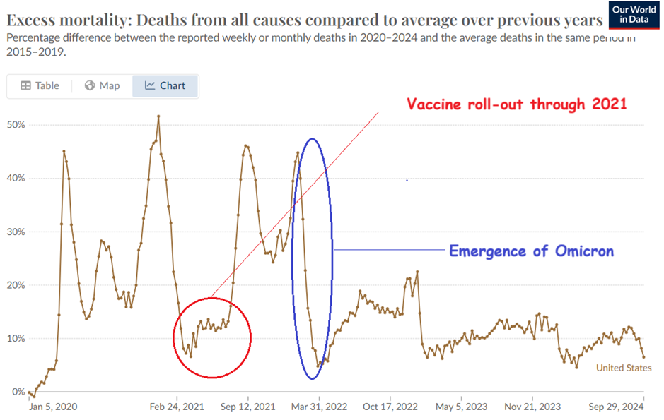 Not if you are poisoning people by continuing to “vaccinate” them repeatedly, the proportion that become ill and die is going to stay fairly stable and elevated.