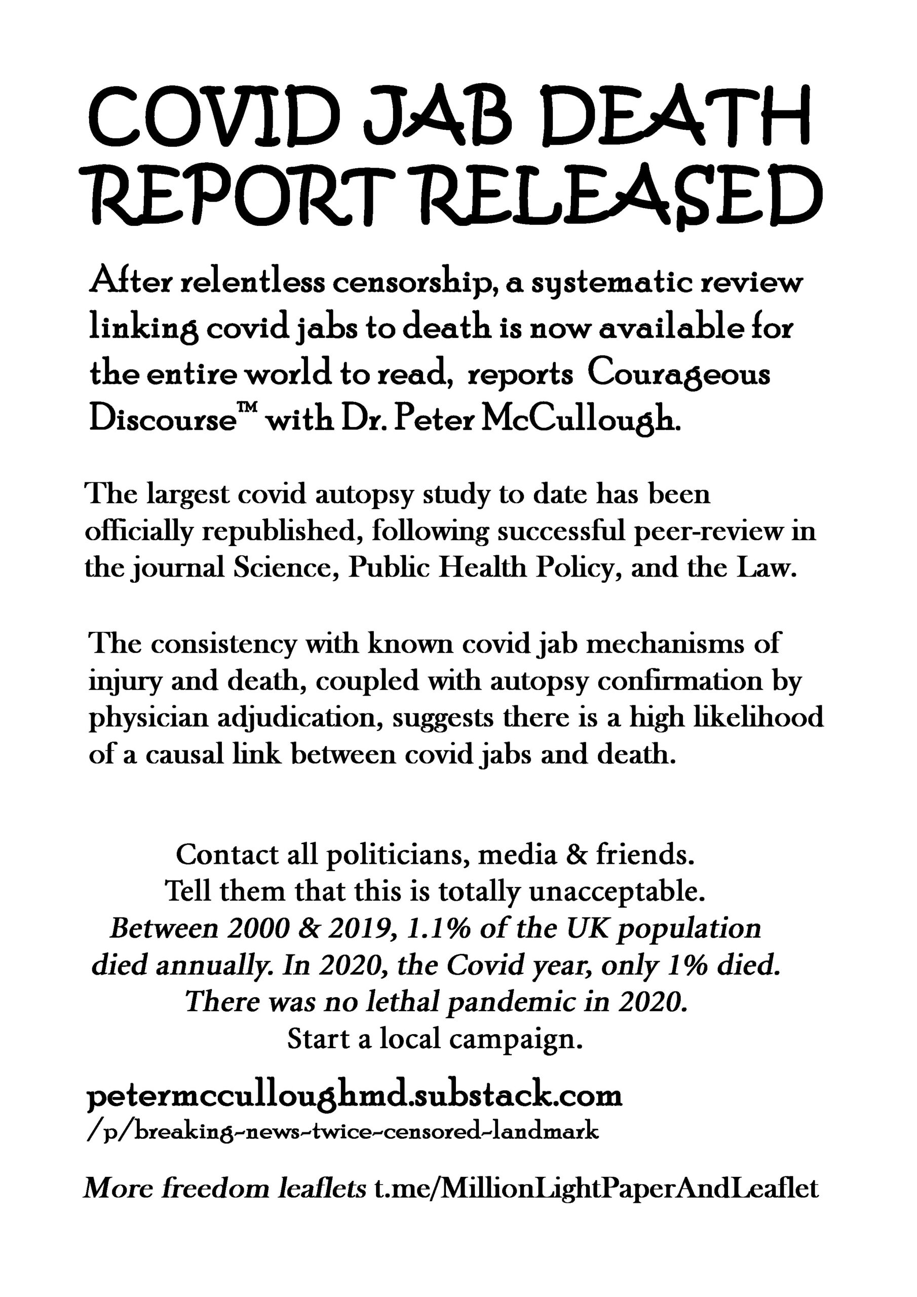 Covid Jab Death Report Released – latest leaflet to print at home and deliver to neighbours or forward to politicians, your new MP, your local vicar, online media and friends online. Start a local campaign. We have over 200 leaflet ideas on the link on the leaflet.