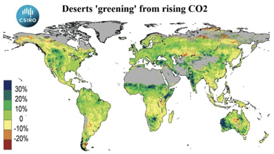 This is borne out by considerable evidence, although the recent substantial ‘greening’ of the planet is largely hidden from readers reliant on mainstream media. In fact the new ‘green revolution’ is feeding the world. The authors of a recent science paper, Charles Taylor and Wolfram Schlenker, state: “We consistently find a large fertilisation effect; a 1 ppm increase in CO2 equates to a 0.4%, 0.6%, 1% yield increase for corn, soybean and wheat respectively.” The heavy greening of the Earth can be seen in a map first published in Donohue/CSIRO 2015 and republished in another recent paper from the CO2 Coalition. This examined the nutritive value of plants growing in enhanced CO2 concentrations.