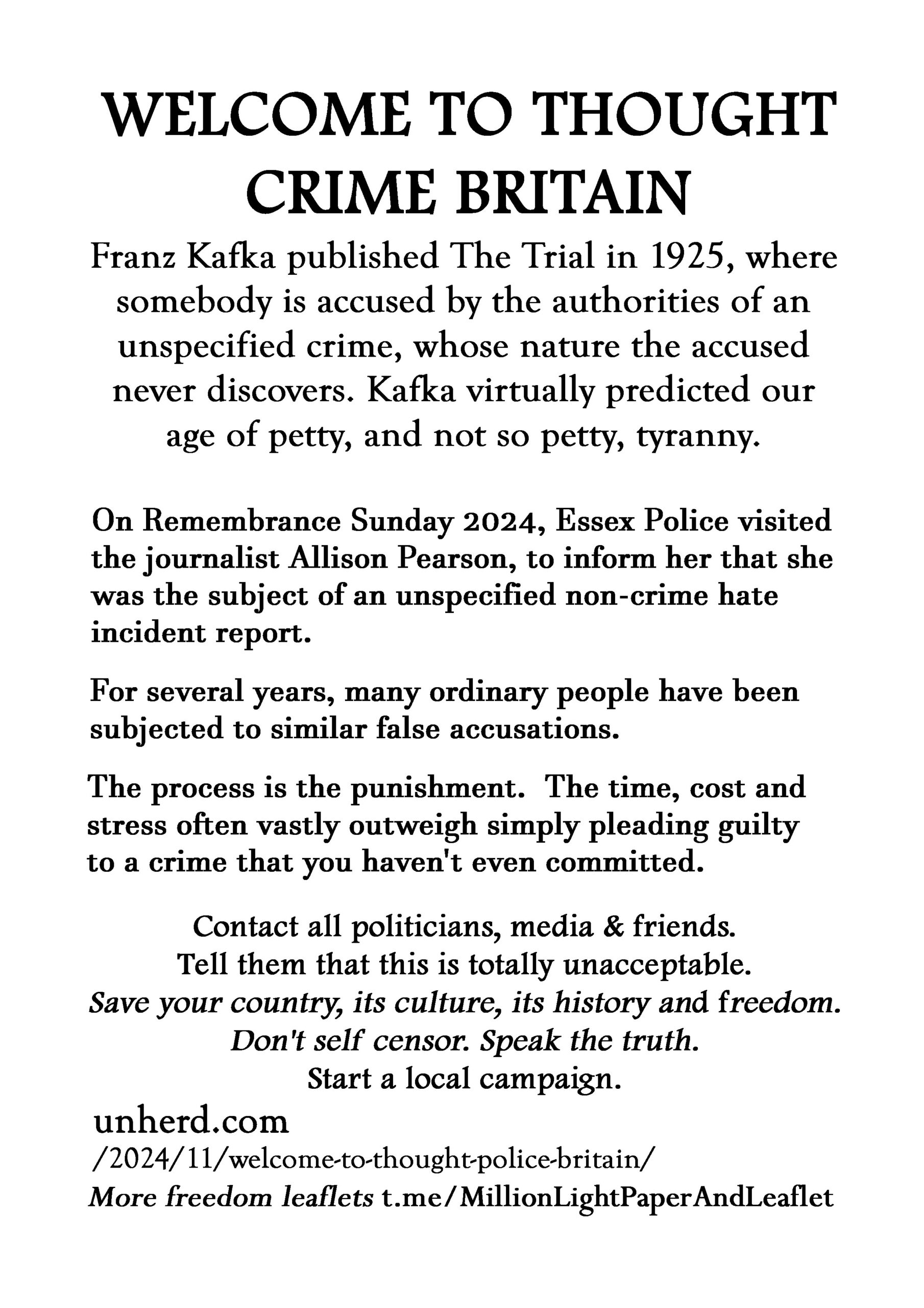 Welcome To Thought Crime Britain – latest leaflet to print at home and deliver to neighbours or forward to politicians, your new MP, your local vicar, online media and friends online. Start a local campaign. We have over 200 leaflet ideas on the link on the leaflet.
