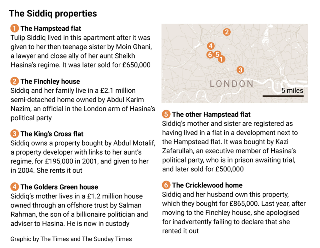 Following the revelation in Friday’s Financial Times that Tulip Sidiqq, Labour’s Economic Secretary to the Treasury and the minister tasked with tackling financial crime and corruption, was given a flat in King’s Cross by a person connected with the party of the recently ousted Bangladeshi government, the news broke last night that she lived for years in a second freebie property, this one gifted to her sister by an ally of Sheikh Hasina, the now disgraced ex-Prime Minister of Bangladesh. The Sunday Times has more.