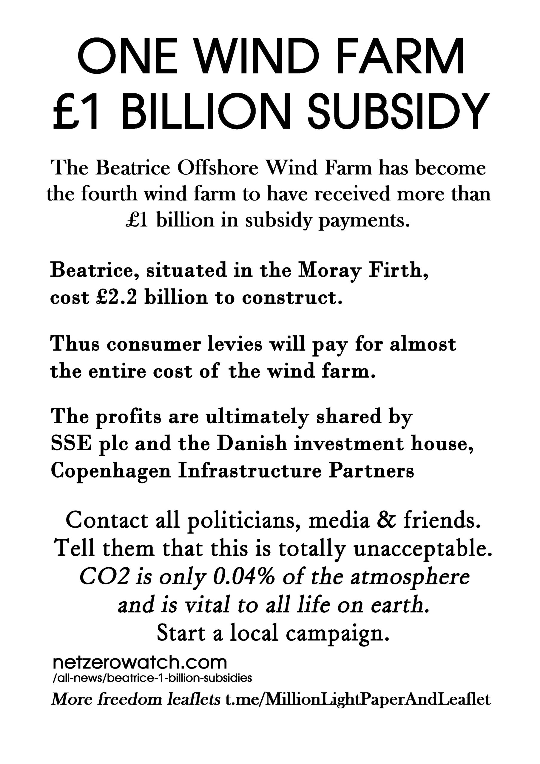One Wind Farm £1 Billion Subsidy – latest leaflet to print at home and deliver to neighbours or forward to politicians, your new MP, your local vicar, online media and friends online. Start a local campaign. We have over 200 leaflet ideas on the link on the leaflet.