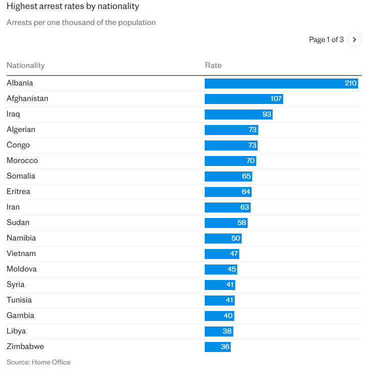 The crime league table places Albanians as the nationality most likely to be arrested, followed by Afghans, Iraqis, Algerians and Somalians. There were 48 nationalities with a higher arrest rate per 1,000 of their populations than British suspects.