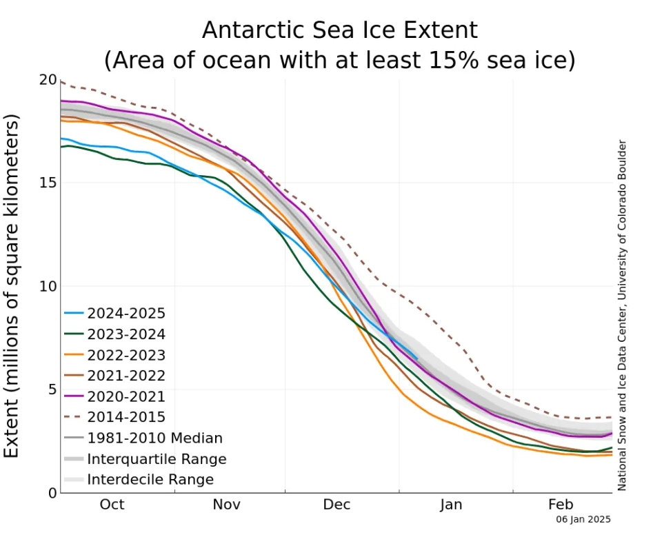 During November and December 2024, mid to late spring in the Southern Hemisphere, the daily Antarctica sea ice loss was 140,000 square kilometres compared to 165,000 sq kms for the 1981-2010 average. By the end of December the sea ice extent was roughly around the average recorded in the 30 years to 2010. Now it seems the NSIDC is a re-convert to stressing long-term trends, noting that the 2016-2024 timeline “is too short to definitely determine that a regime shift has occurred”.