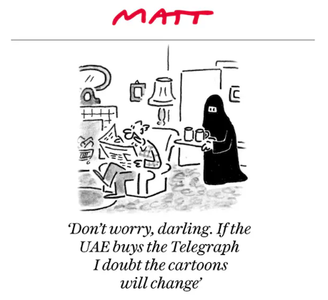 Matt Pritchett’s cartoon published in January last year depicts a housewife wearing a burka in a sideswipe at the prospect of Abu Dhabi purchasing the Telegraph amid concerns over human rights violations in the Gulf State.