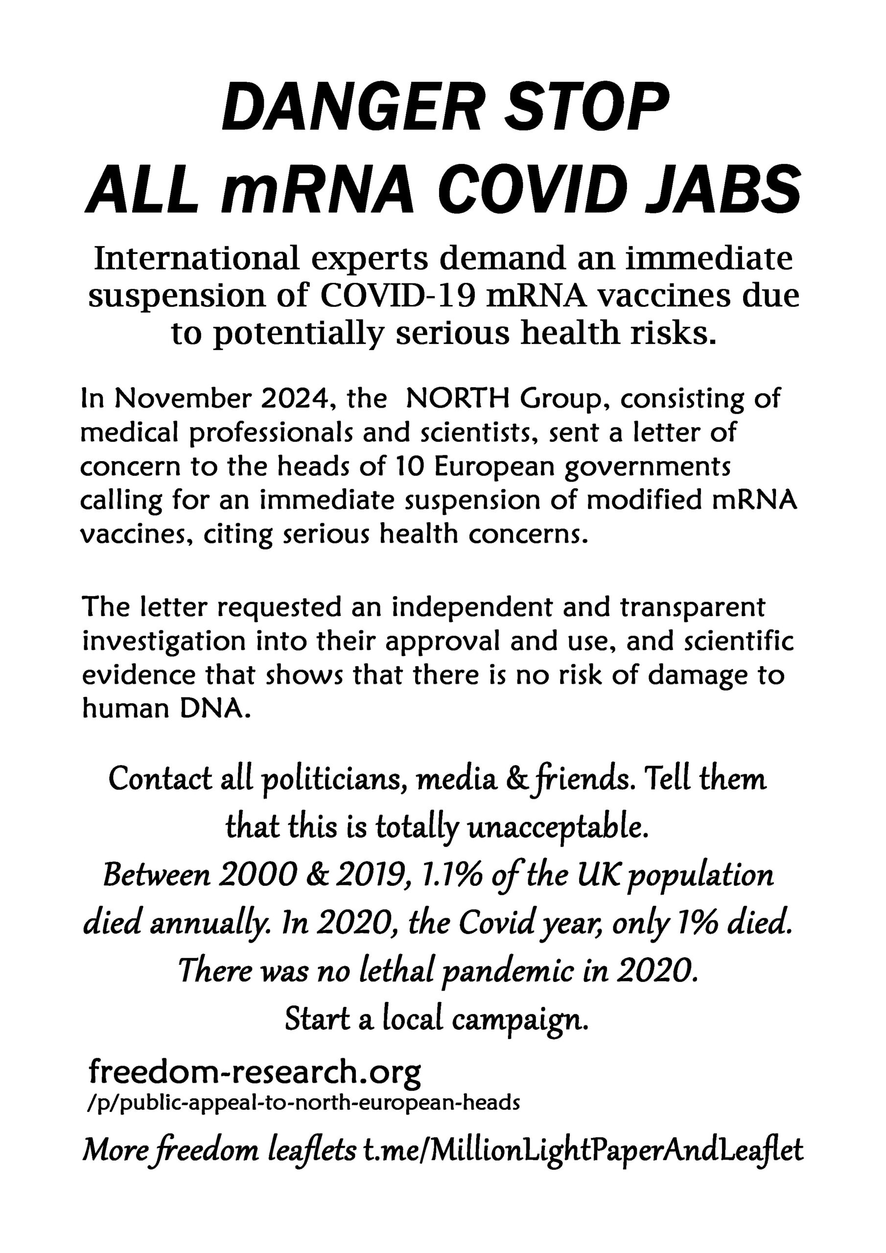 Danger Stop All mRNA Covid Jabs – latest leaflet to print at home and deliver to neighbours or forward to politicians, your new MP, your local vicar, online media and friends online. Start a local campaign. We have over 200 leaflet ideas on the link on the leaflet.