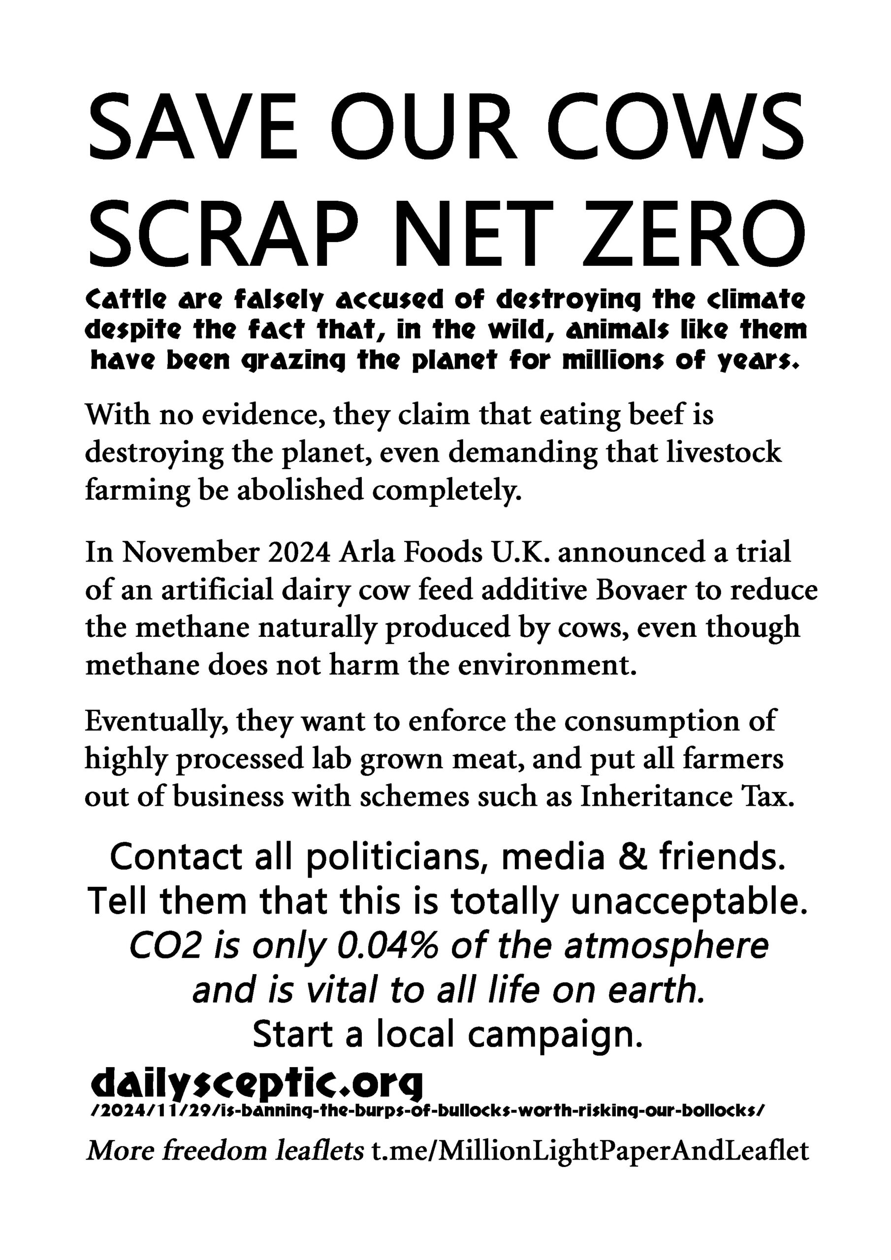 Save Our Cows Scrap Net Zero – latest leaflet to print at home and deliver to neighbours or forward to politicians, your new MP, your local vicar, online media and friends online. Start a local campaign. We have over 200 leaflet ideas on the link on the leaflet.