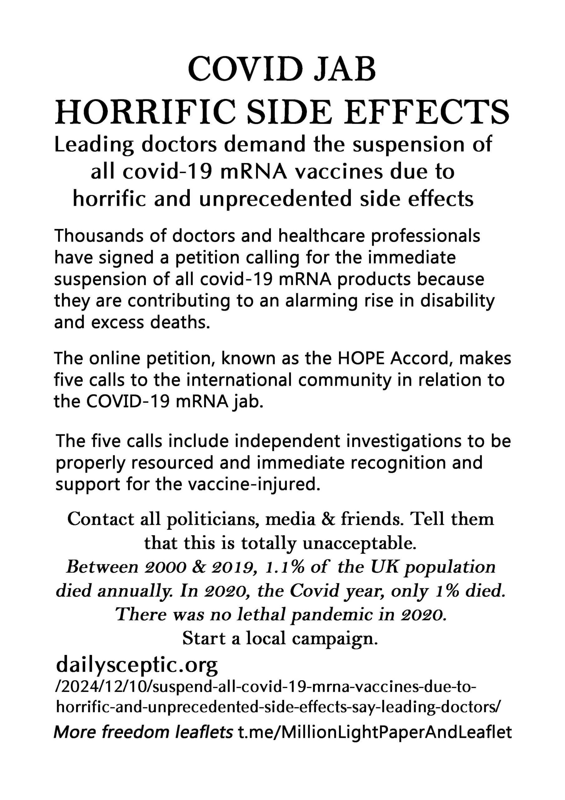 Covid Jab Horrific Side Effects – latest leaflet to print at home and deliver to neighbours or forward to politicians, your new MP, your local vicar, online media and friends online. Start a local campaign. We have over 200 leaflet ideas on the link on the leaflet.