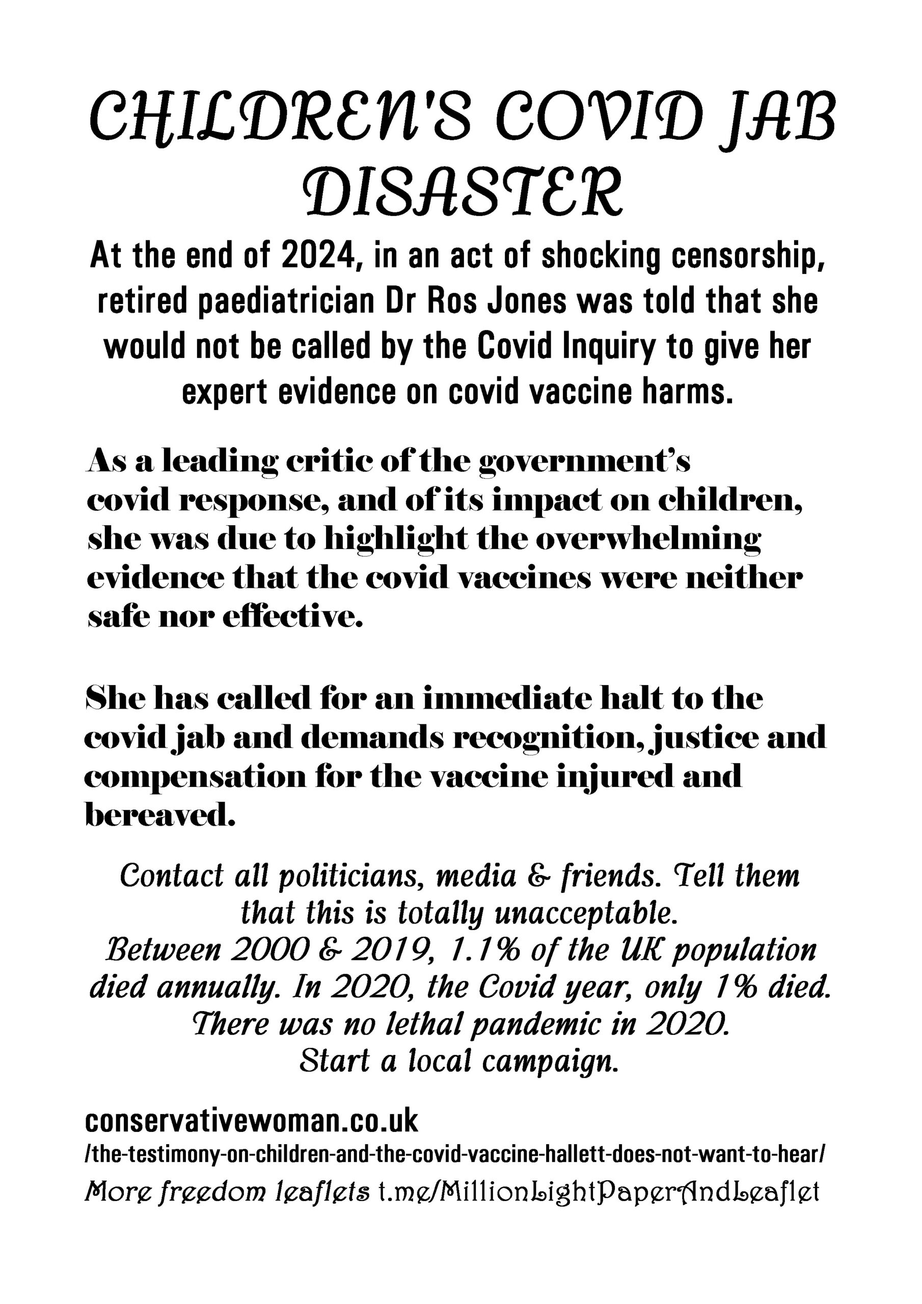 Children’s Covid Jab Disaster – latest leaflet to print at home and deliver to neighbours or forward to politicians, your new MP, your local vicar, online media and friends online. Start a local campaign. We have over 200 leaflet ideas on the link on the leaflet.